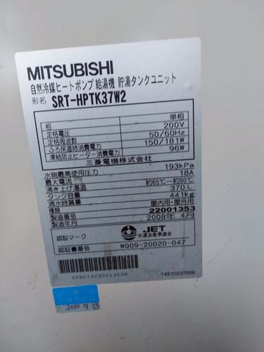 大津市浜大津 三菱電機自然冷媒ヒートポンプ給湯機 貯湯タンクユニットSRT-HPTK37W2→コロナ自然冷媒CO2家庭用ヒートポンプ給湯機 ヒートポンプユニットCHP-DZ451K エコキュート交換工事